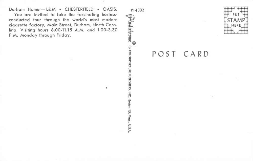Durham North Carolina Chesterfield Cigarette Home Vintage Postcard K60008
