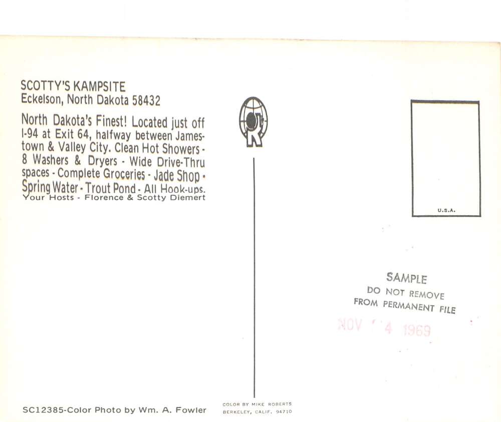 Eckelson North Dakota Scotty’s Kampsite Vintage Postcard AA99763