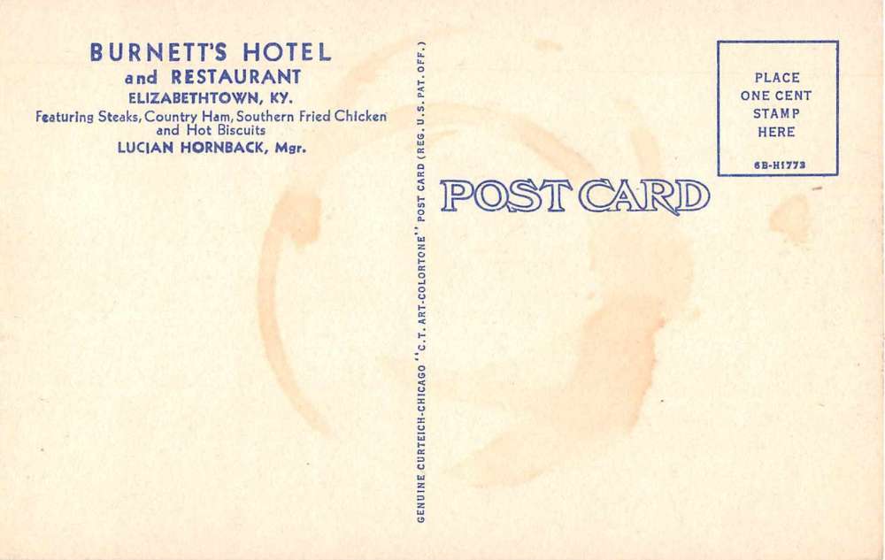 Elizabethtown Kentucky Burnetts Hotel and Restaurant Antique Postcard J52853