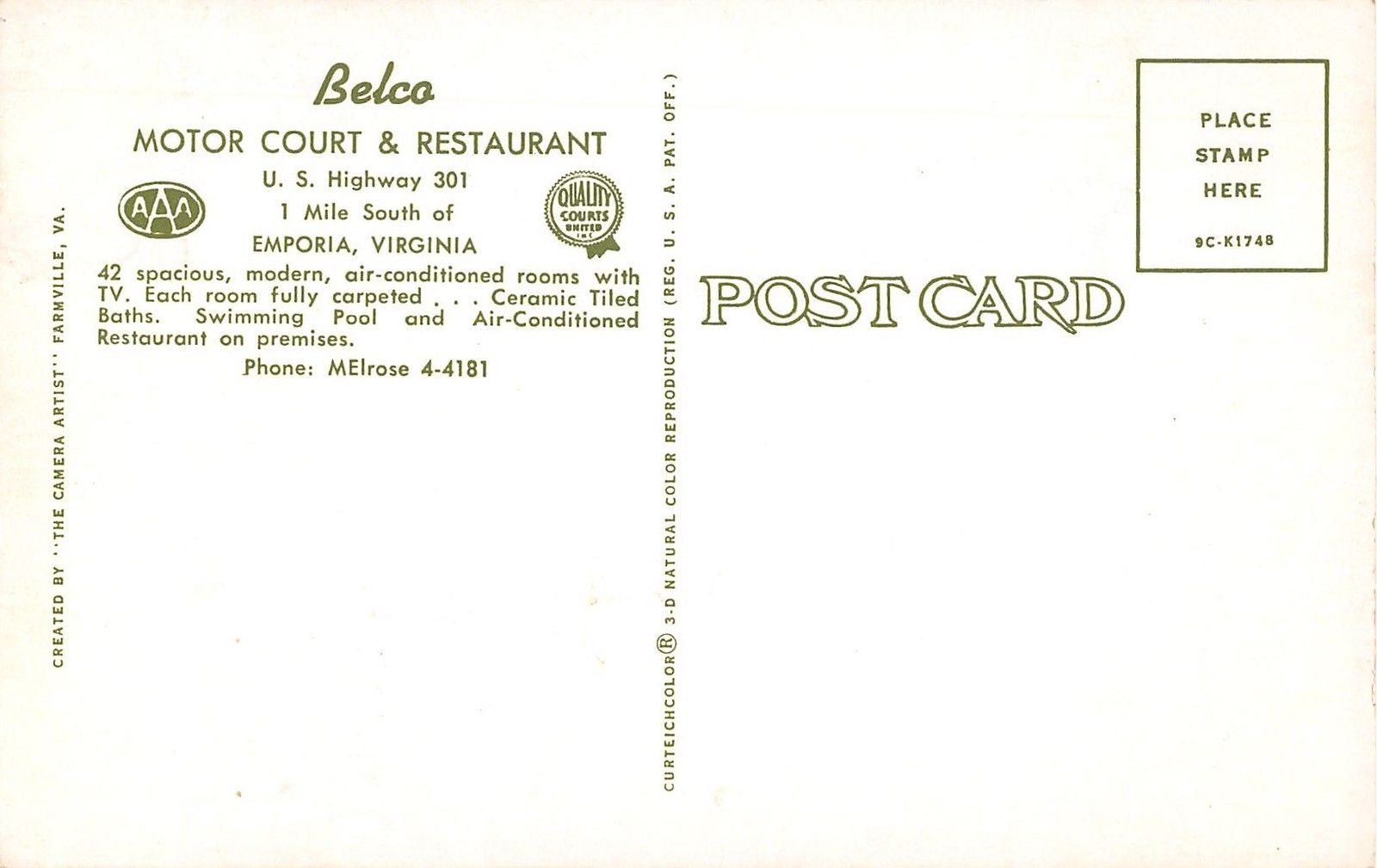 Emporia Virginia Belco Motor Court & Restaurant Vintage Postcard (J15550)