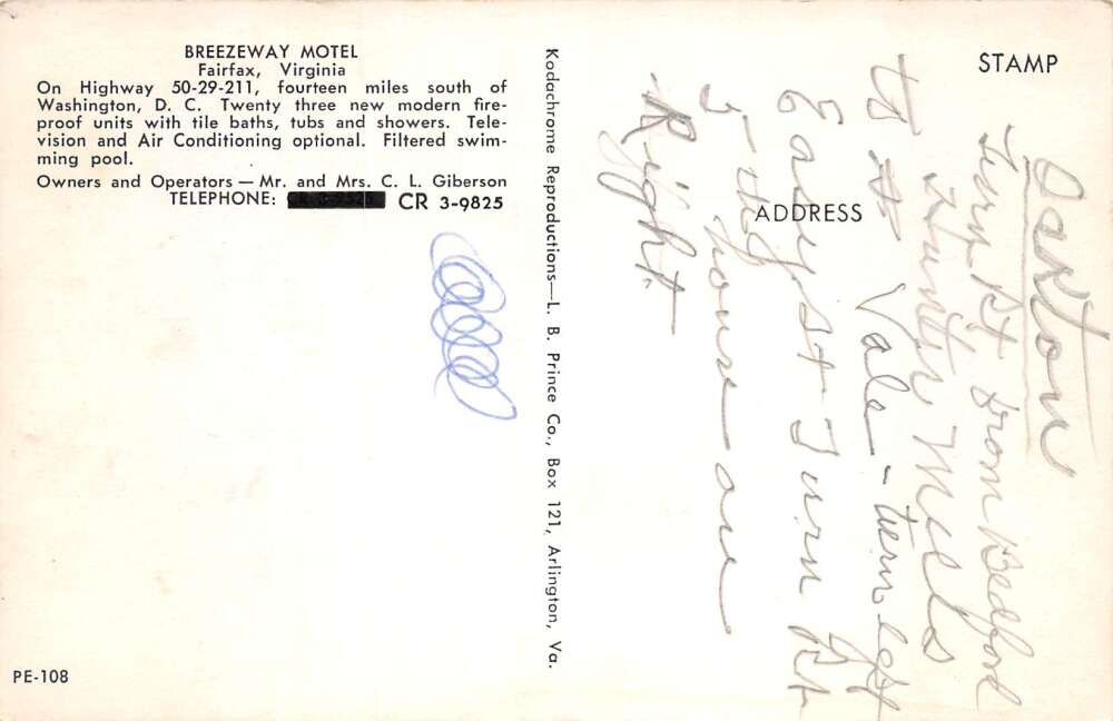 Fairfax Virginia Breezeway Motel Swimming Pool Vintage Postcard AA111027