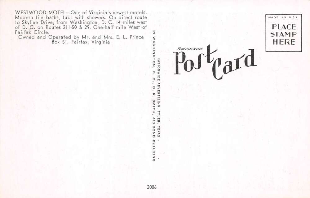 Fairfax Virginia Westwood Motel, B/W Chrome, Vintage Postcard U24490