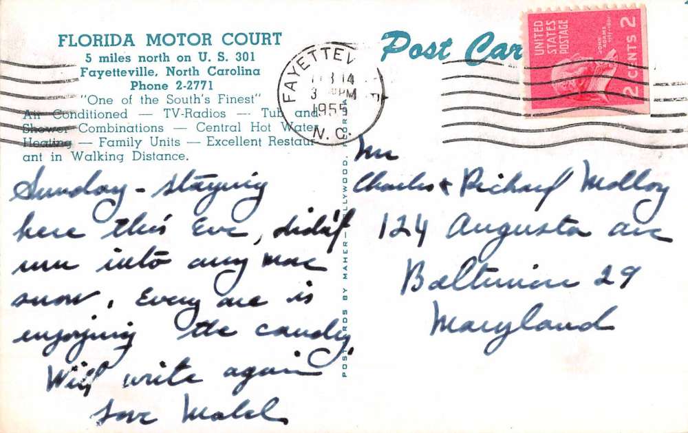 Fayetteville North Carolina Florida Motor Court Vintage Postcard K76833