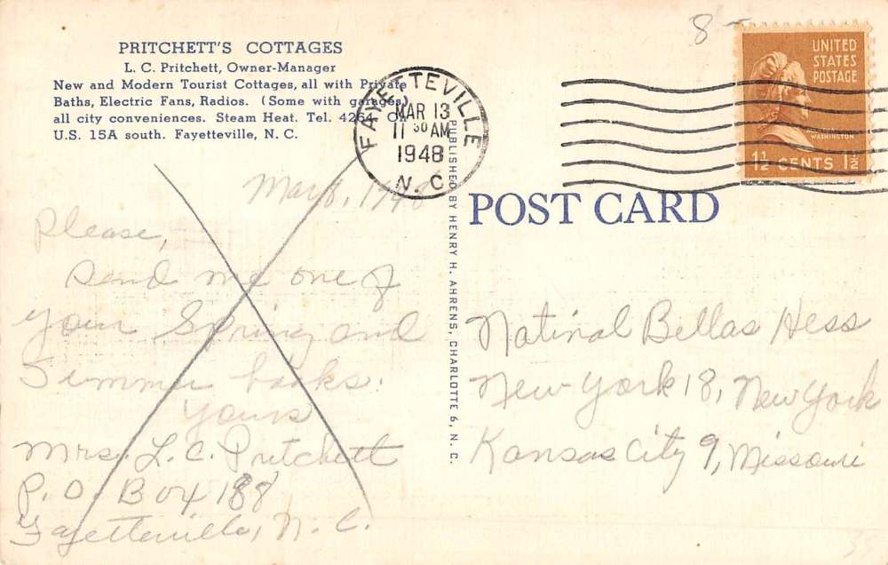 Fayetteville North Carolina Pritchetts Cottages Antique Postcard K90760