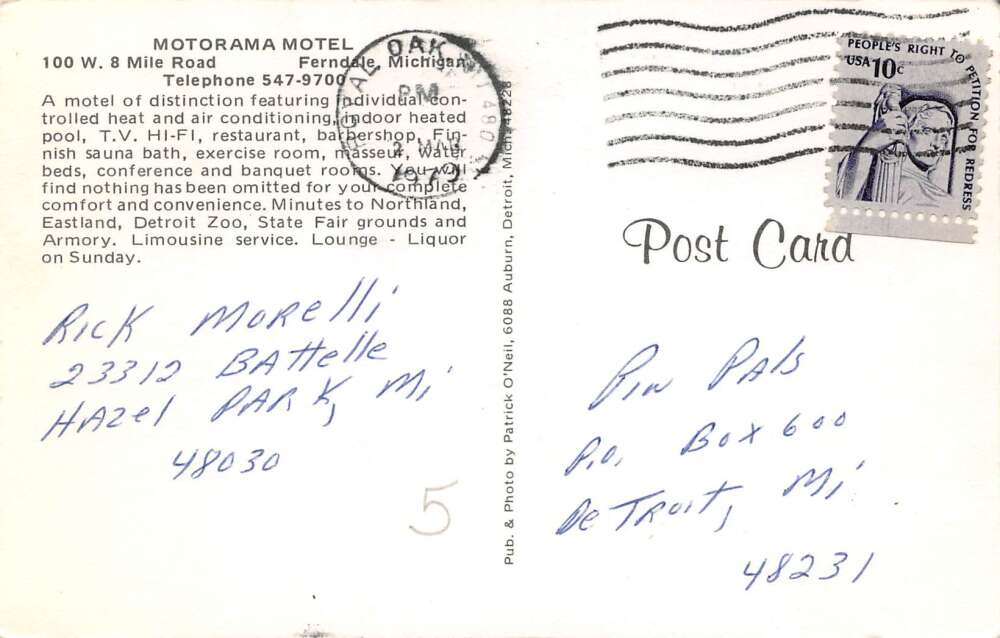 Ferndale Michigan Motorama Motel, Photochrome Vintage Postcard U12978