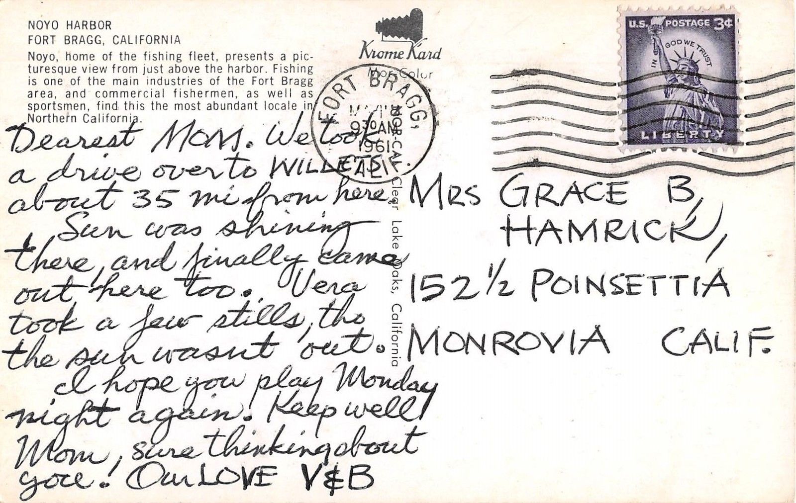 Fort Fragg California Noyo Harbor Vintage Postcard (J13333) Good Condition.