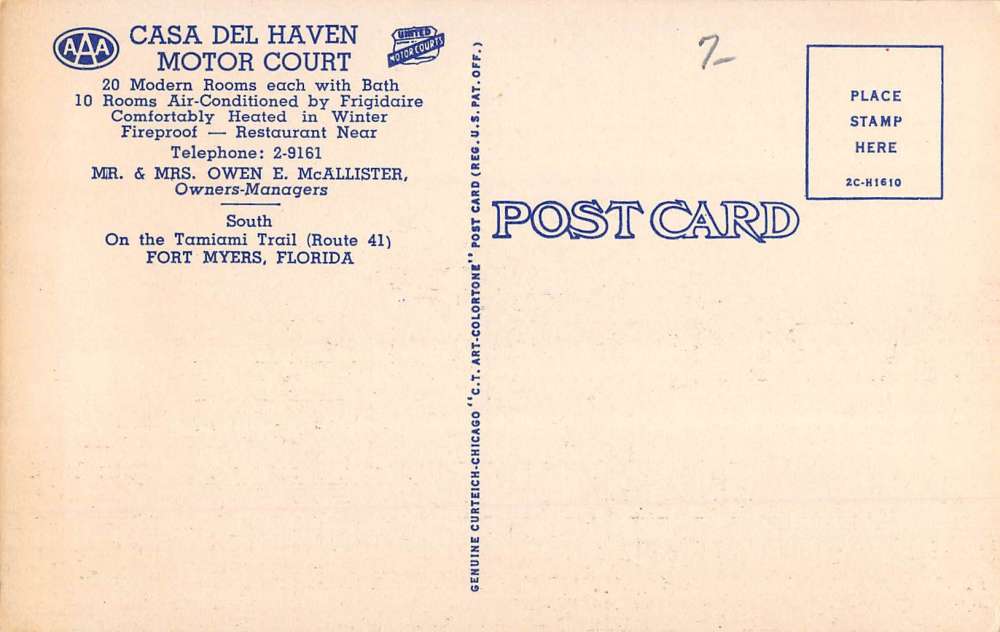 Fort Myers Florida Casa Del Haven Motor Court Antique Postcard K71268