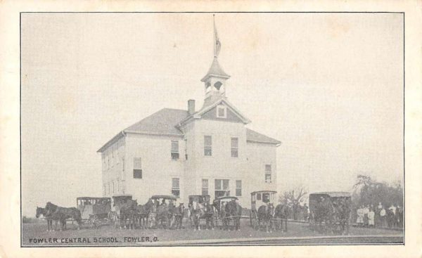 Fowler Ohio birds eye view horses buggies Fowler Central School antique pc BB99