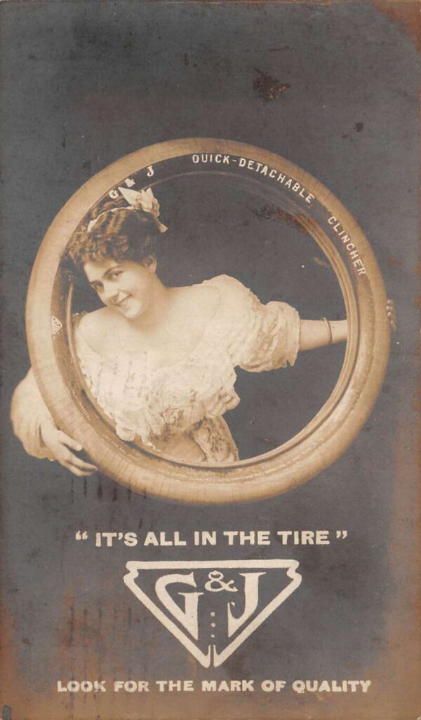 G and J Tire Co Advertising Woman Holding Car Tire Real Photo Postcard AA82081