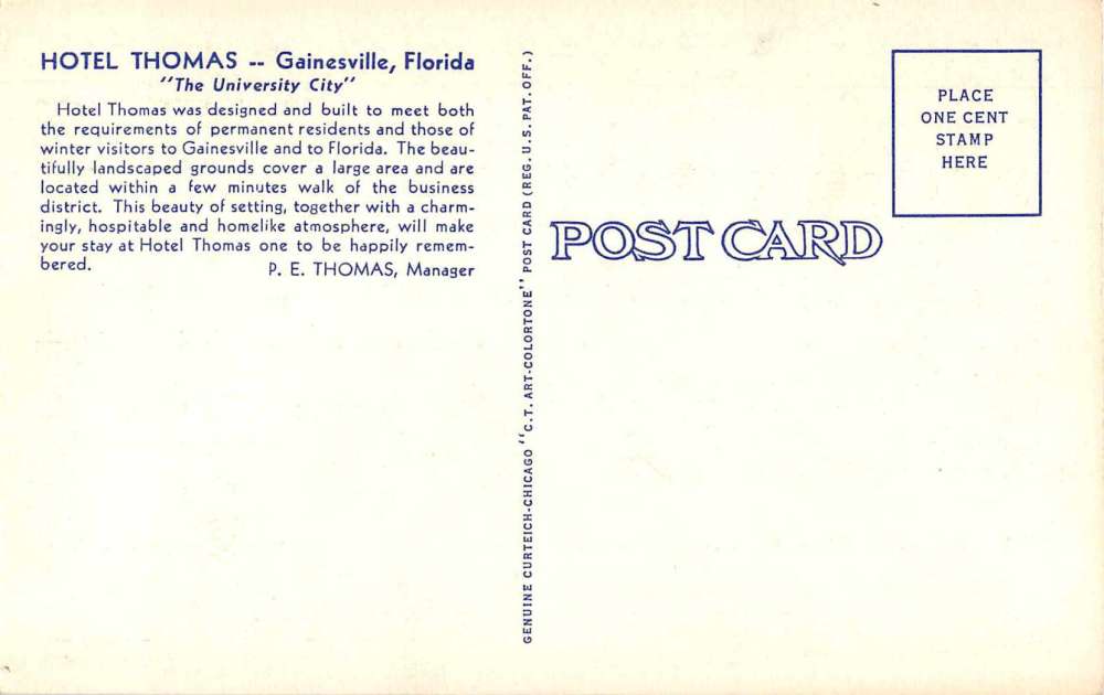 Gainesville Florida Hotel Thomas Linen Antique Postcard J52257