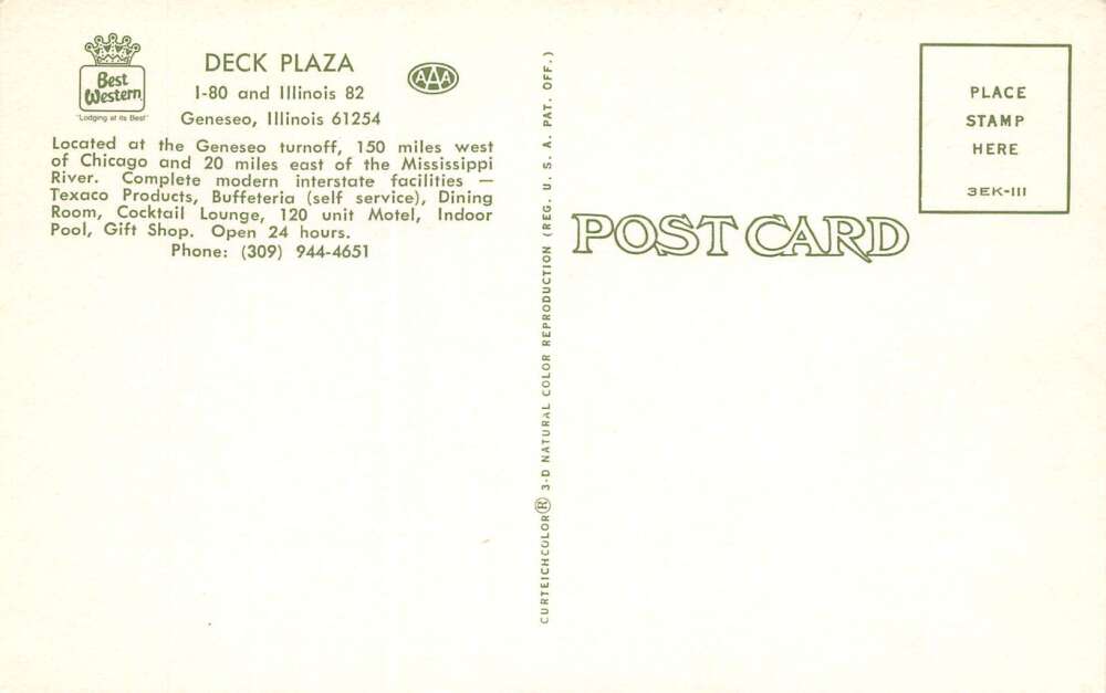 Geneseo Illinois Deck Plaza, Food, Motel & Gas Station, Vintage PC U23252