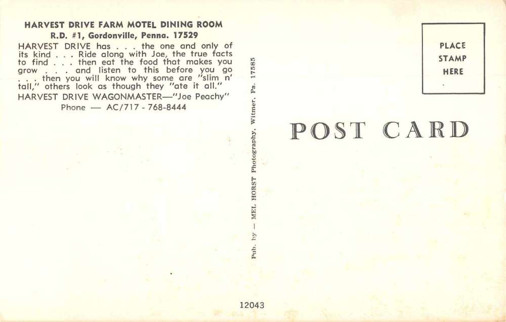 Gordonville Pennsylvania Harvest Drive Farm Motel Dining Room Postcard J68363