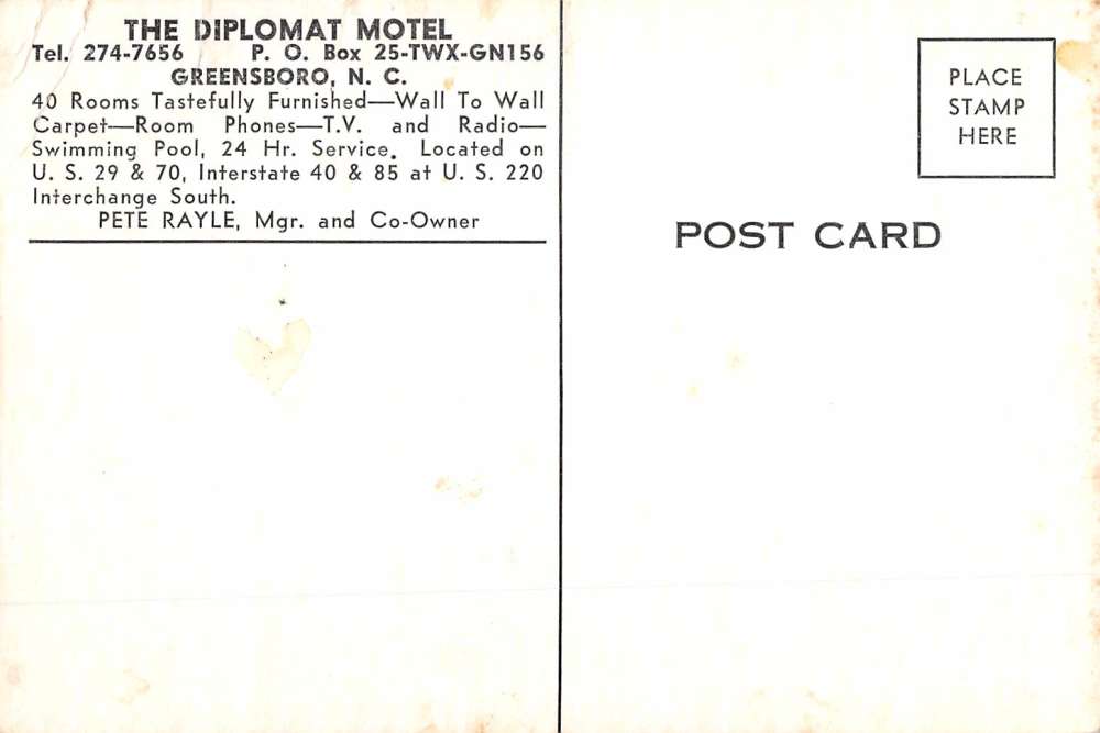 Greensboro North Carolina Diplomat Motel Street View Vintage Postcard K55008