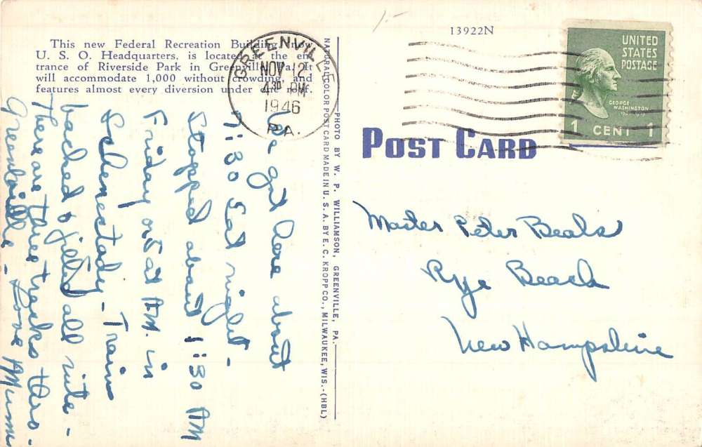 Greenville Pennsylvania USO Center Federal Rec Bldg Antique Postcard K71642