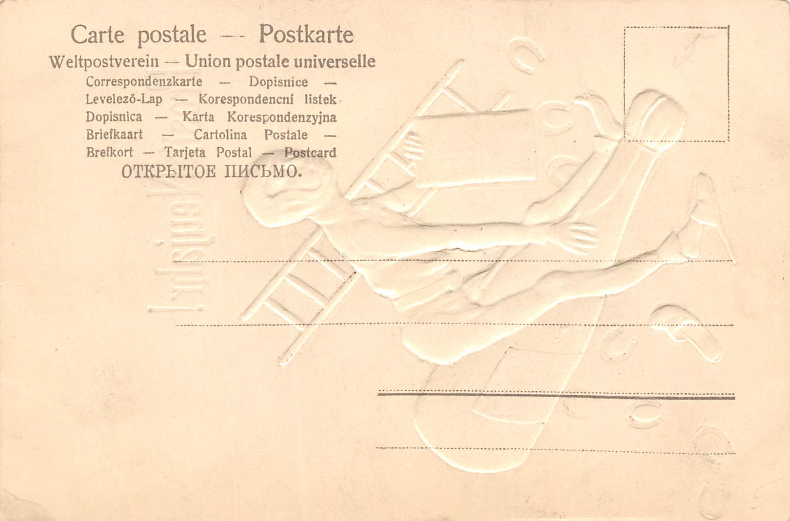 Happy New Year, Man W/ Ladder & Horseshoes On Champagne Bottle, PC U17009