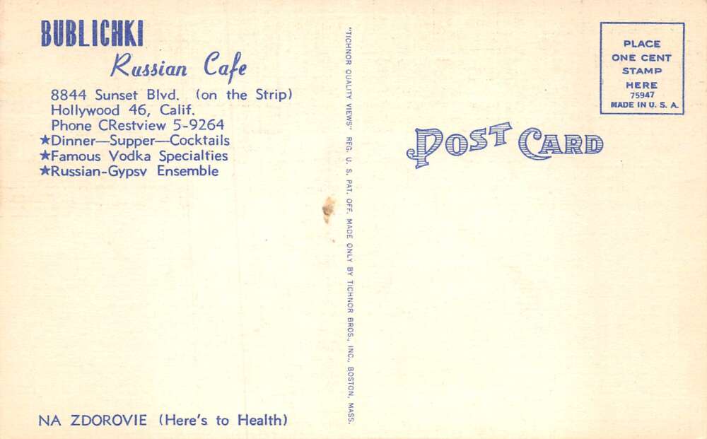 Hollywood California Bublichki Russian Cafe Restaurant Vintage Postcard AA72680