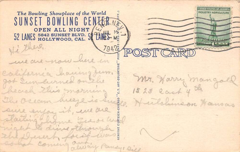 Hollywood California Sunset Bowling Center, Interior W/ Score Card, PC U10976