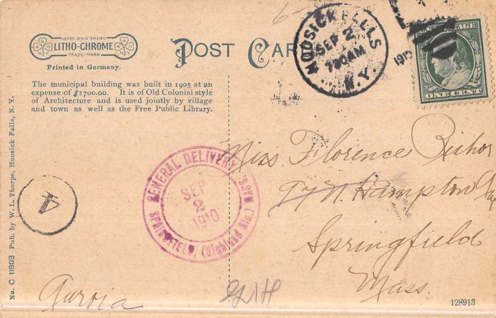 Hoosick Falls New York Municipal Building Street View Antique Postcard K45490