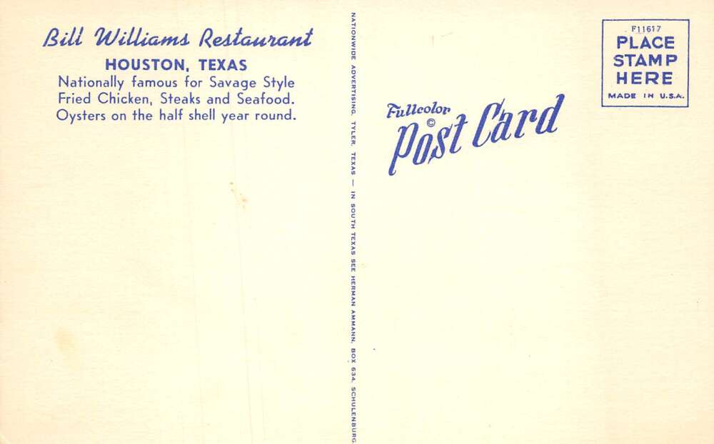 Houston Texas Bill Williams Restaurant Linen Vintage Postcard AA71794