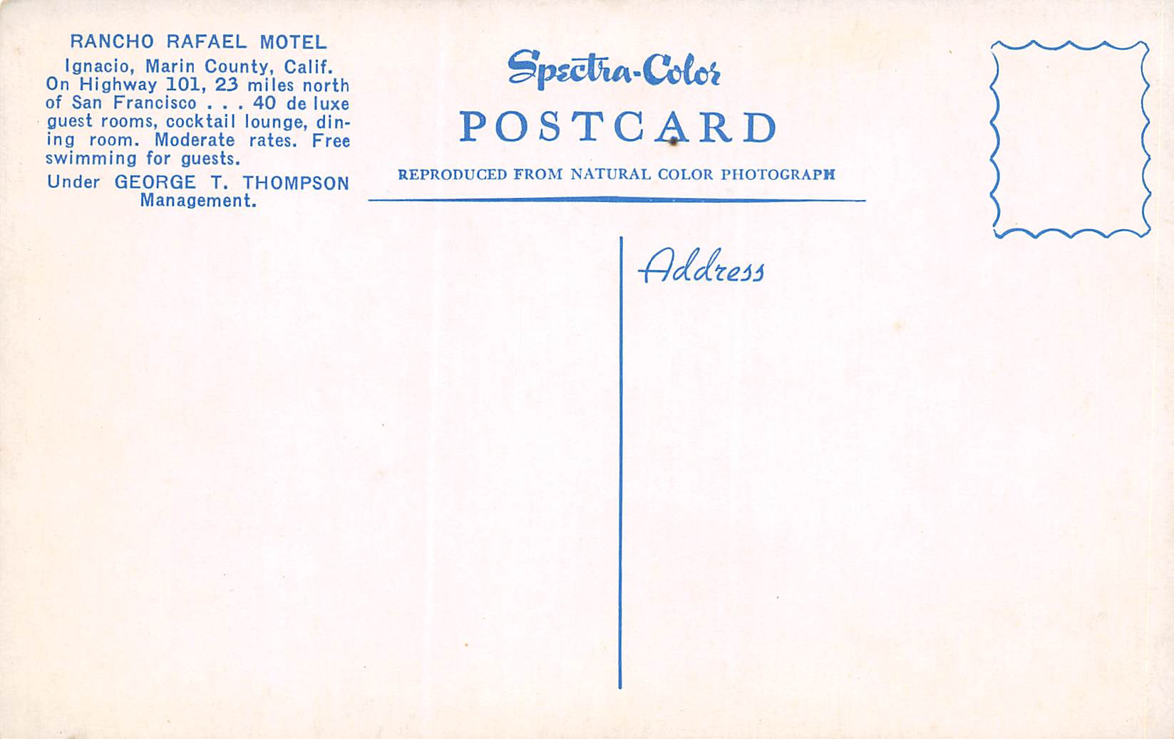 Ignacio California Rancho Rafael Motel, Photochrome Vintage Postcard U11184