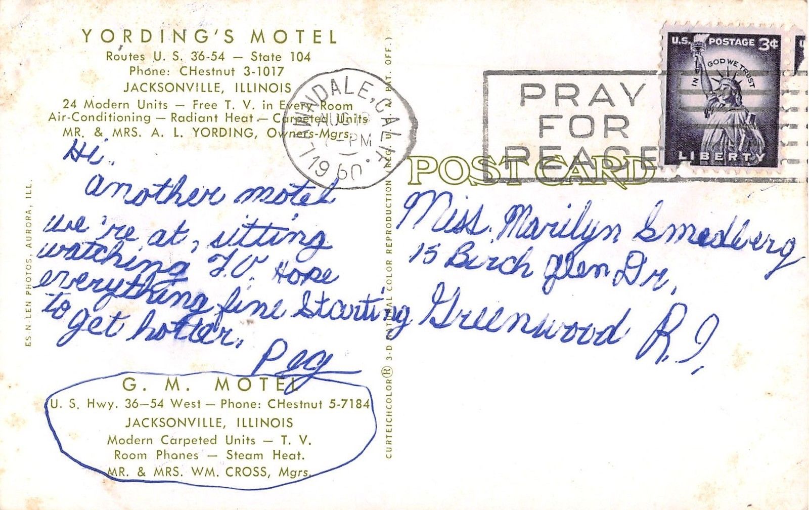 Jacksonville Illinois Yording’s Motel & GM Motel Vintage Postcard (J15545) Good Condition.