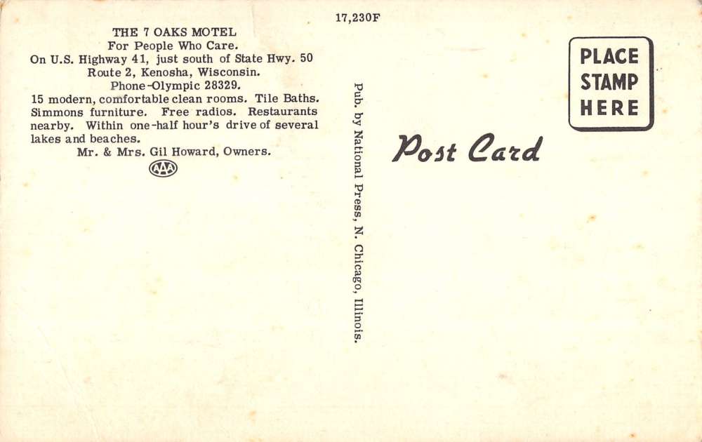 Kenosah Wisconsin The 7 Oaks Motel Street View Antique Postcard K19402
