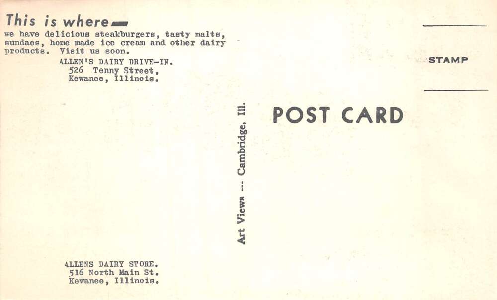 Kewanee Illinois Allen’s Dairy Drive In Vintage Postcard AA110985