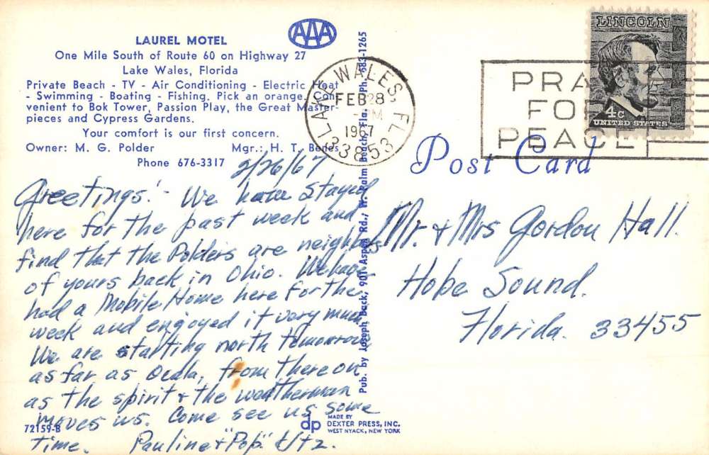 Lake Wales Florida Laurel Motel Waterfront Vintage Postcard K87283