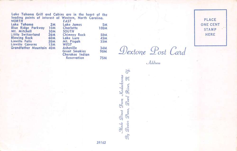 Marion North Carolina Lake Tahoma Grill and Cabins Vintage Postcard AA72016