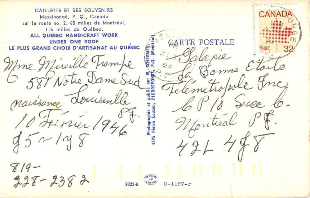 Maskinonge Quebec Canada Cailette et ses Souvenirs Postcard J77136