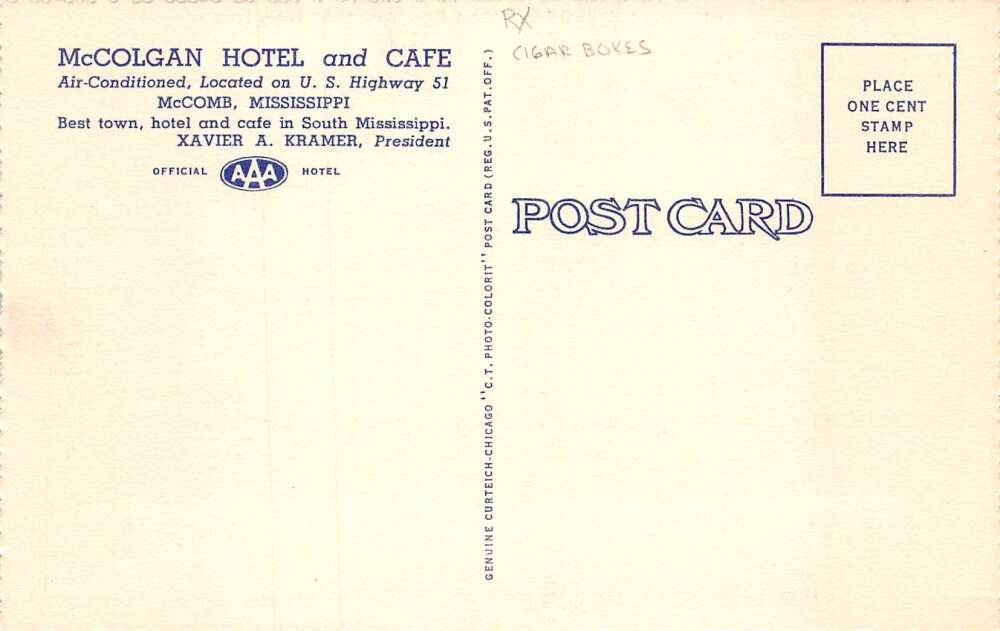 McComb Mississippi McColgan Hotel Cafe Cigar Boxes Linen Postcard AA59520