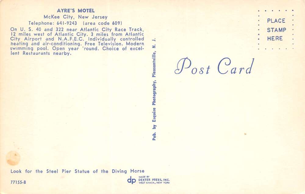 McKee City New Jersey Ayre’s Motel, Aerial, Photochrome, Vintage Postcard U12568