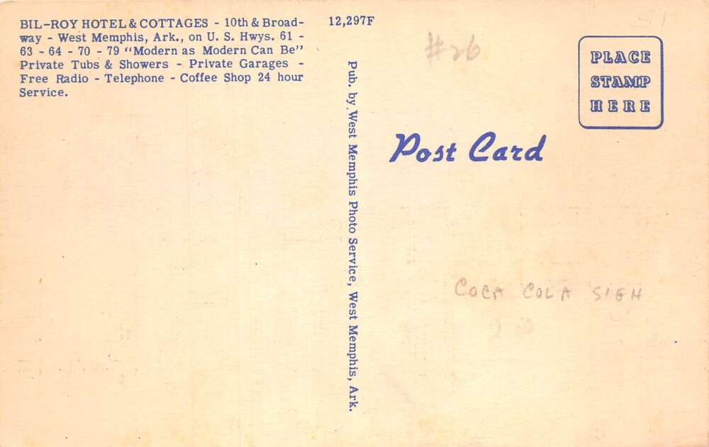 Memphis Arkansas Bil-Roy Hotel Coke Sign Vintage Postcard AA108687