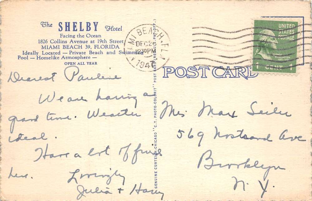 Miami Beach Florida Shelby Hotel Linen Vintage Postcard AA72035