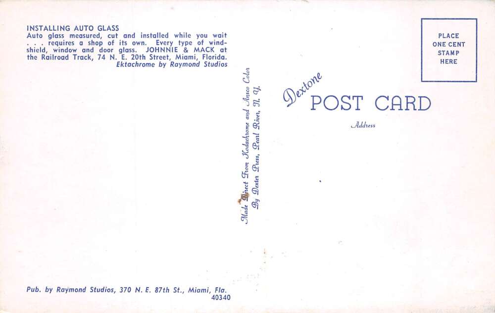 Miami Florida Johnnie and Mack Auto Glass Shop Vintage Postcard AA110002