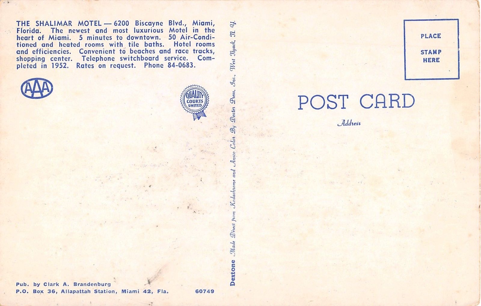 Miami Florida Shalimar Motel Vintage Postcard (J15547) Good Condition.