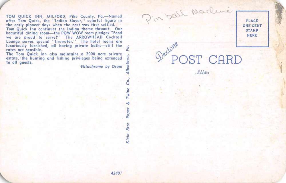 Milford Pennsylvania Tom Quick Inn Arcade Room Pin Ball Machine PC JE359454