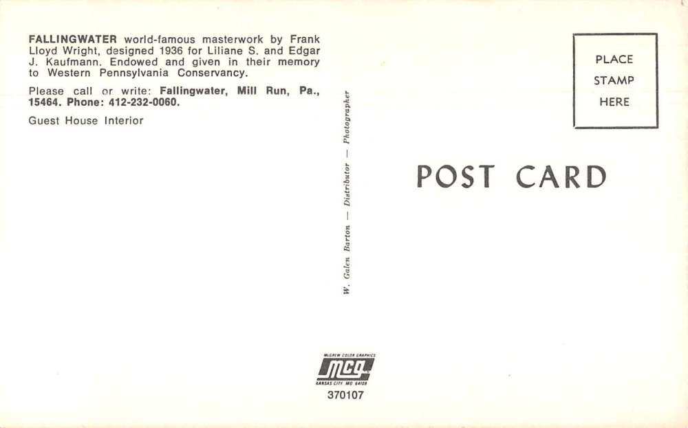 Mill Run Pennsylvania Fallingwater Interior Frank Lloyd Wright Postcard J74481