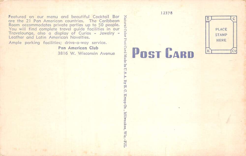 Milwaukee Wisconsin Pan American Club Cocktail Lounge Vintage Postcard AA112487