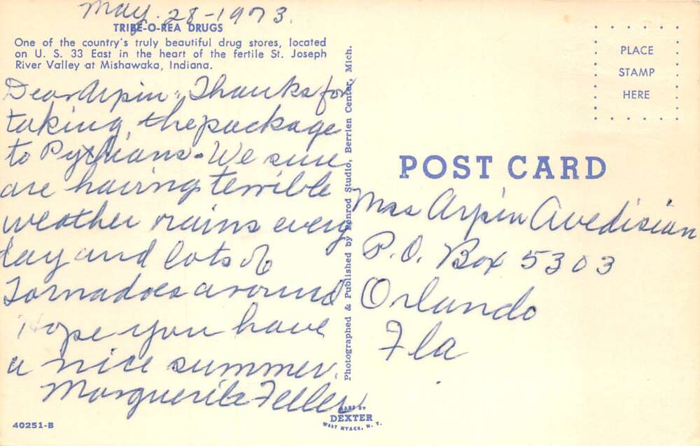 Mishawaka Indiana Tribe-o-Rea Drug Store Vintage Postcard AA104247