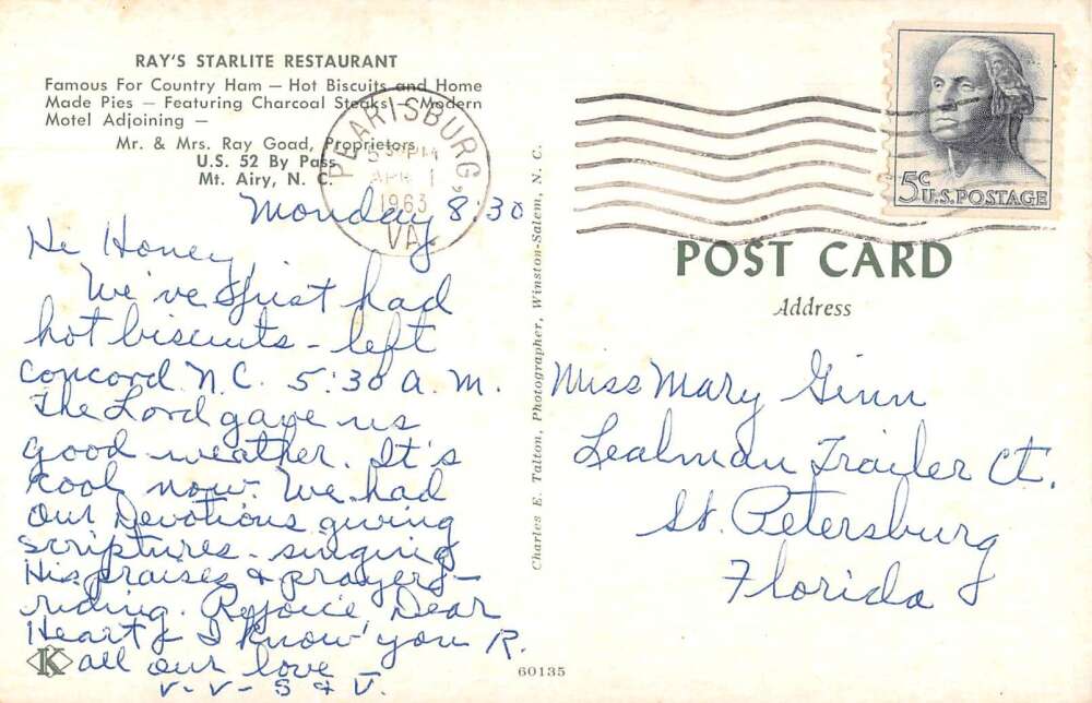 Mt Airy North Carolina Ray’s Starlite Restaurant Vintage Postcard AA35201
