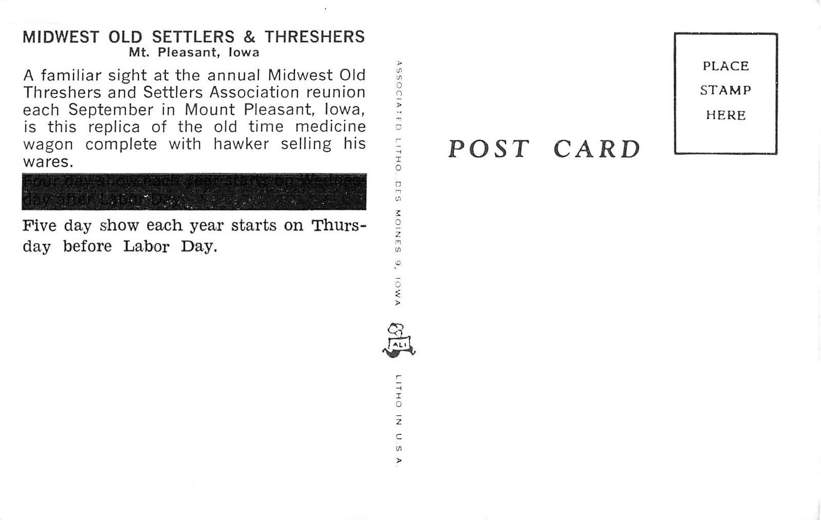 Mt. Pleasant Iowa Midwest Annual Old Settlers & Threshers Vintage PC V15418. Good condition.