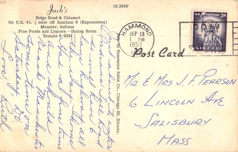 Munster Indiana Jack’s Restaurant Vintage Postcard AA36862