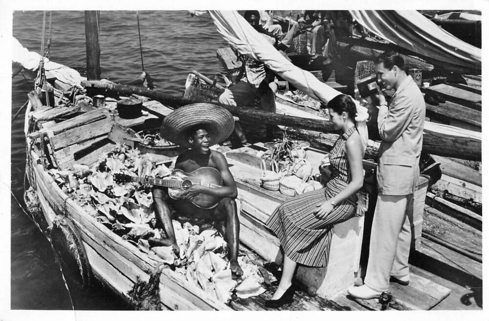 Nassau Bahamas Fisherman’s Wharf Man Playing Guitar Real Photo Postcard AA51427