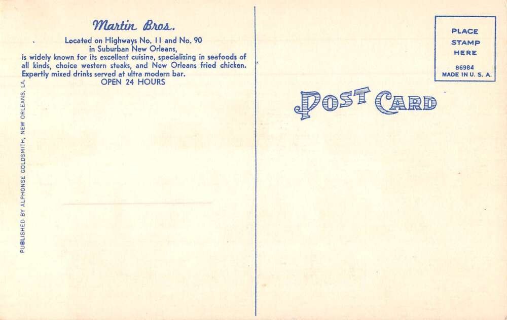 New Orleans Louisiana Martin Bros. Restaurant Vintage Postcard AA44741