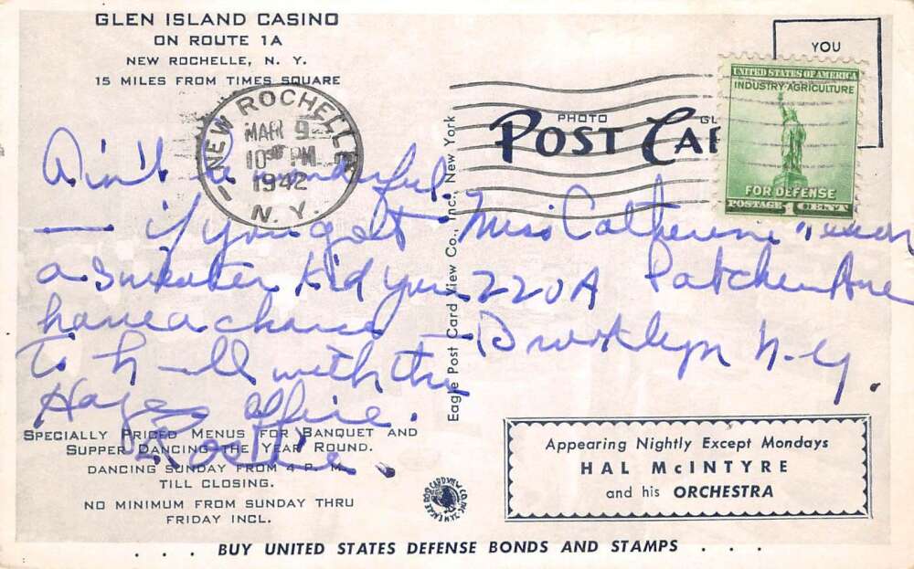 New Rochelle New York Glen Island Casino Hal McIntyre Musician Postcard AA112658