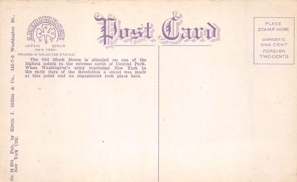 New York City Central Park Revolutionary Block House Vintage Postcard AA109270