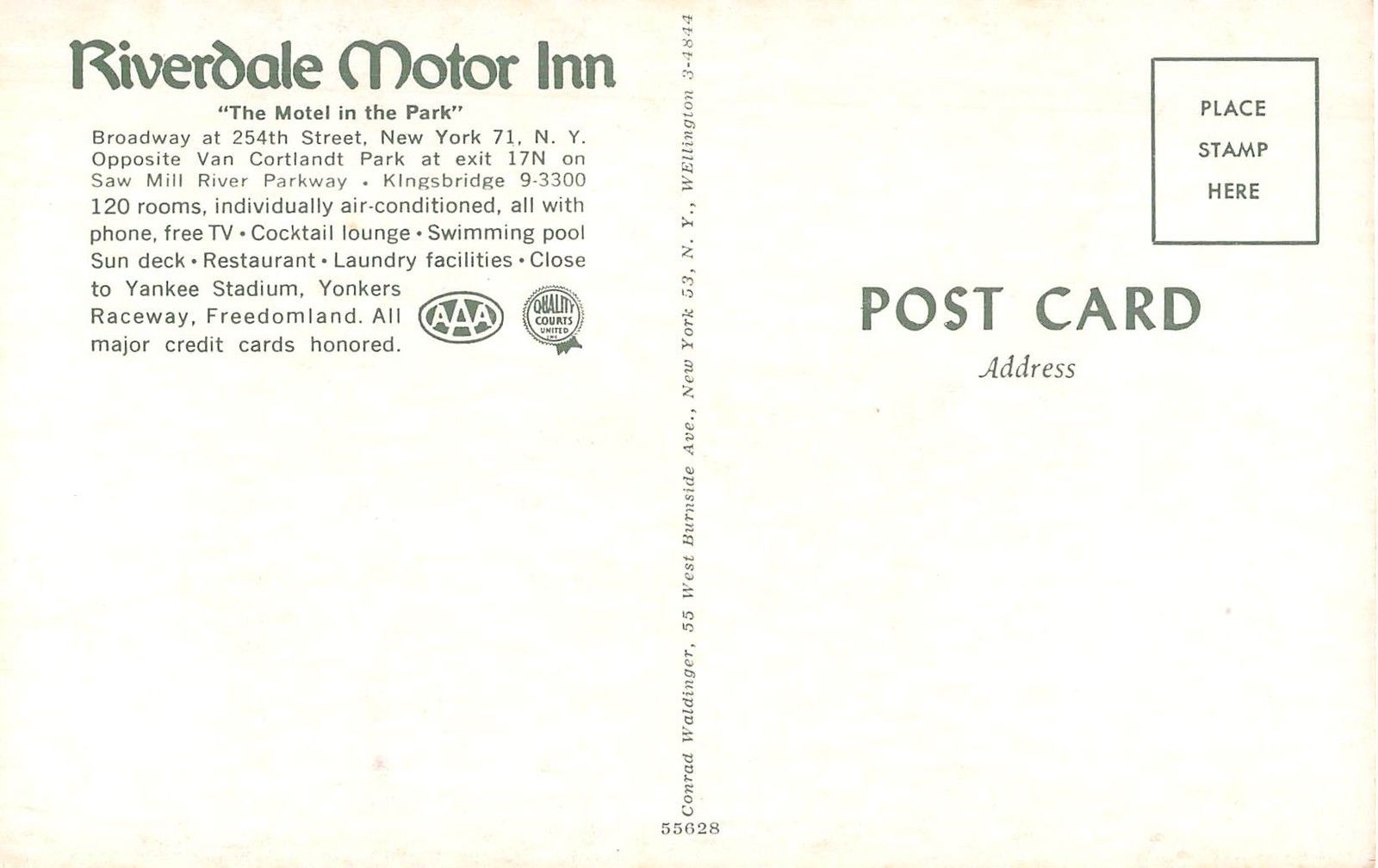 New York City Riverdale Motor Inn Vintage Postcard (J15414) Good Condition.