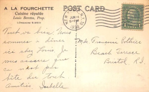 New York Montmartre Restaurant A La Fourchette Dining Room Real Photo PC AA69672