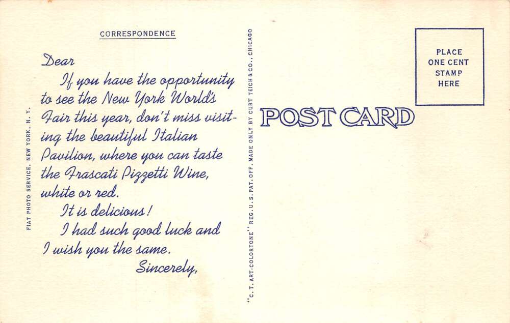 New York Worlds Fair Frascati Pizzetti White Wine Italian Pavilion PC AA110747